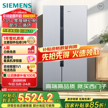 西门子SIEMENS KA96FA19TI对开门冰箱,569L大容量设计,T型三门结构,零度保鲜技术,混冷无霜更省心。适合家庭储鲜需求,银色外观时尚百搭,仅需3555.56元,品质生活从这里开始。