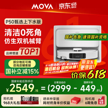 MOVA P50甄选系列扫拖一体机,型号RLP52HE,上下水版自动清洗拖布,集尘、烘干一步到位。支持热水洗拖布,高效清洁不伤地。国家补贴叠加PLUS会员优惠,到手仅需2538.95元,适合家庭全屋智能清洁需求,省心更省力!