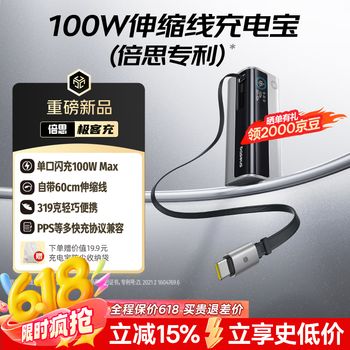 倍思 极客充充电宝自带线100W大功率快充小巧移动电源10000毫安苹果华为小米手机电脑适用