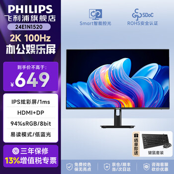 飞利浦23.8英寸显示器,型号24E1N1520,采用2K分辨率100Hz IPS屏,支持1ms响应和原生8bit色彩,低蓝光护眼,接口丰富(HDMI+DP),设计升降旋转更灵活。仅551.64元,适合办公、设计及游戏场景,性价比之选!