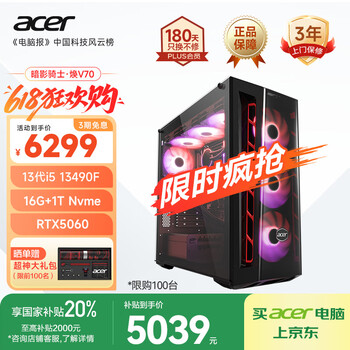 国家补贴、PLUS会员:宏碁 暗影骑士·焕V70黑神话 13代酷睿i5 13490F/16G/1T/RTX5060 电脑台式主机