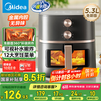 美的空气炸锅KZE538J5,家用大容量5.3L设计,免翻面技术搭配可视窗口,嫩烤不干柴,操作更便捷。金属腔体无异味,适合家庭聚餐或日常烹饪。现价仅117.82元,领券更划算,轻松享受健康美食!