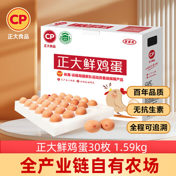 正大食品鲜鸡蛋,30枚礼盒装,总重1.59kg,富含优质蛋白,是健康早餐的完美选择!京东百亿补贴特惠价仅21.68元,适合家庭日常食用或送礼,新鲜直达,品质保证,让每一天从营养开始。