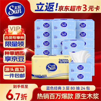 太阳(sun)抽纸3层加厚80抽*24包纸巾抽取式面巾纸软抽 源头直发