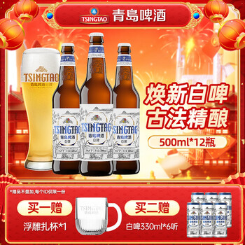 青岛啤酒(TsingTao)全麦白啤精选麦芽酿造瓶装箱啤 原麦汁浓度10°P 500mL 12瓶 整箱装